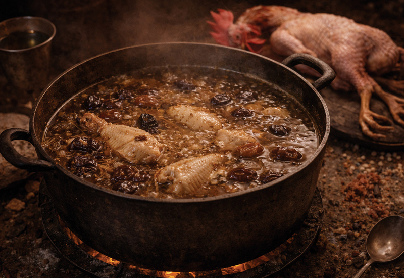 2. Варите его в белом вине, потом добавьте горсть фиников и изюма и варите их вместе с птицей, пока они не размякнут и не отдадут бульону сладость былой придворной жизни.
