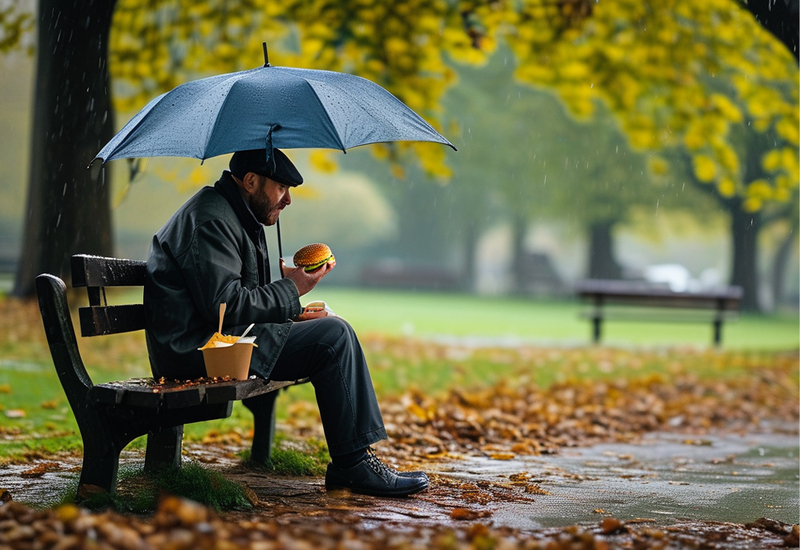 10) покупаете еду в ресторане навынос, чтобы съесть ее на скамье в ближайшем парке, иногда под дождем;