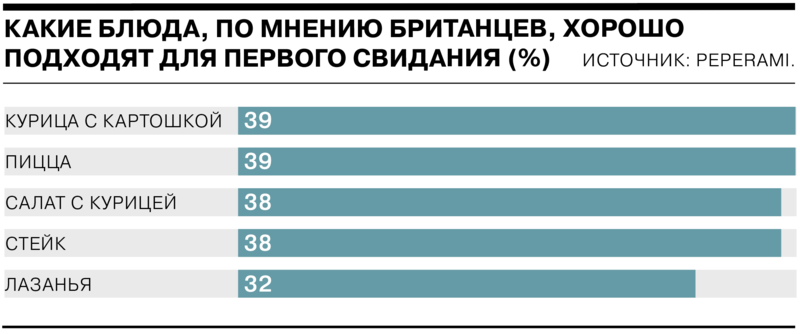 Выяснилось, что самыми популярными и «объединяющими» кухнями для первого свидания оказались итальянская (46%), британская (43%) и китайская (24%), а самыми «безопасными» и «привлекательными» блюдами — курица с картошкой, пицца (набрали по 39% одобрения), куриный салат и стейк (по 38%), а также лазанья (32%). Наименее подходящими для свидания яствами стали ребрышки (14%), кукуруза в початках (12%), суши (10%) и другие рыбные блюда, а также еда, щедро приправленная чесноком или луком.