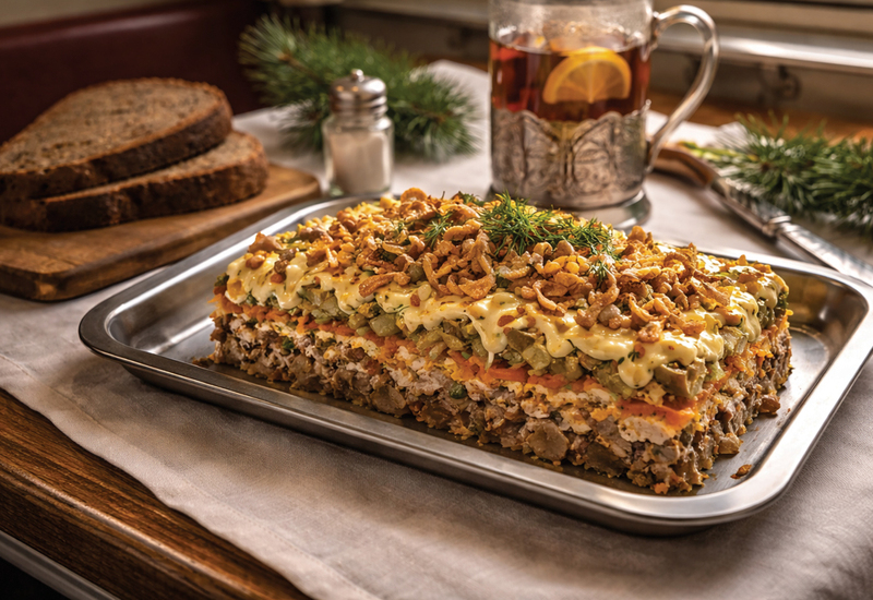 Вы просили редкое и советское? Получите. Это тот самый редкий «вокзальный» салат, от которого веет романтикой плацкарта,— легенда узловых станций, его рецепт передавался шепотом в тамбурах поездов дальнего следования. Этот салат был создан для того, чтобы поднять уровень гемоглобина пассажирам, едущим по маршруту Москва — Владивосток. Главный герой здесь печень. Субпродукт. Орган. В Британии печень едят либо аристократы (в виде паштета), либо коты. Мы же сделаем из нее салат, который пахнет дизелем, дальними странствиями и неизбежностью. В Британии, где сэндвичи в поездах стоят как крыло от боинга, а на вкус напоминают опилки, этот салат — настоящий панк-рок.