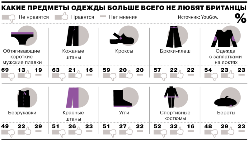 В топ самых нелюбимых предметов одежды, по версии британцев, попали также брюки клеш, безрукавки, красные штаны, одежда с заплатками на локтях, угги и спортивные костюмы.