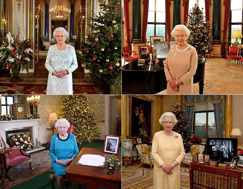 Элементы интерьера лондонской королевской резиденции можно ежегодно увидеть в рождественских обращениях королевы. Ее Величество позирует в Белой гостиной дворца, музыкальной комнате, комнате 1844 года и в комнате Регентства (слева направо).
